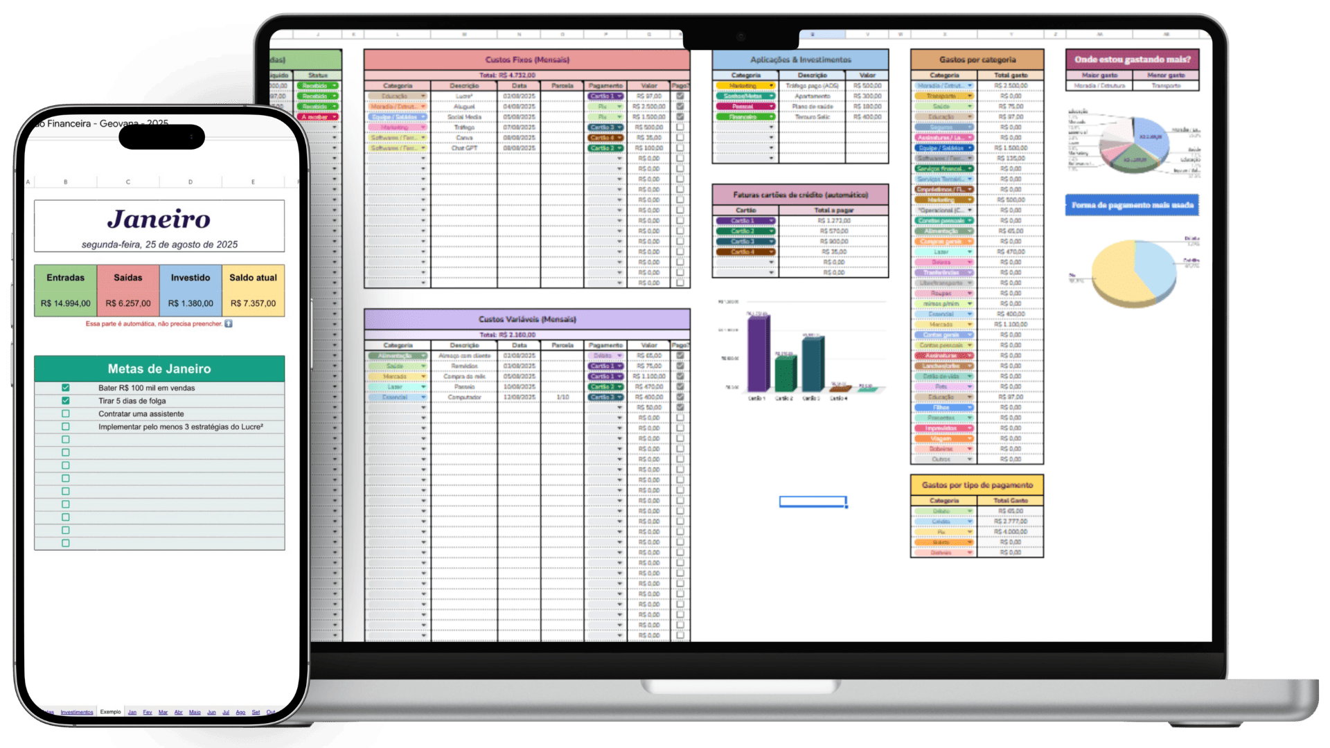 Nessa planilha você vai conseguir registrar entradas, saídas, despesas fixas e variáveis, calcular margens e visualizar o fluxo de caixa do mês.
